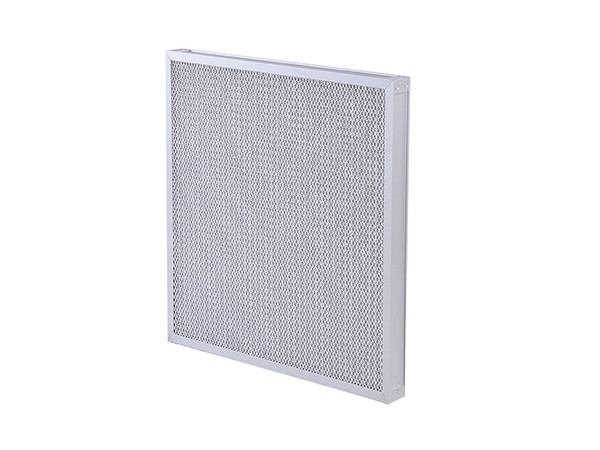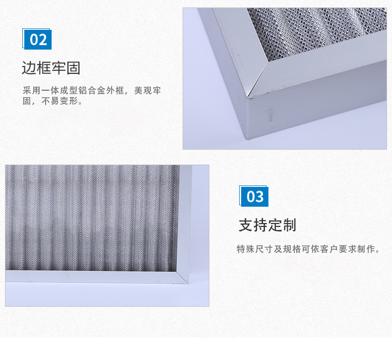 鋁波紋網過濾器采用多層鋁網經輾壓成波浪形,以正確的角度彼此交叉疊合排列而成,多層金屬鋁波紋網是以不同的密度,孔徑由粗到細的排列,使空氣通過濾網時多次改變流動方向,增大其集塵能力及效率。